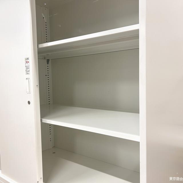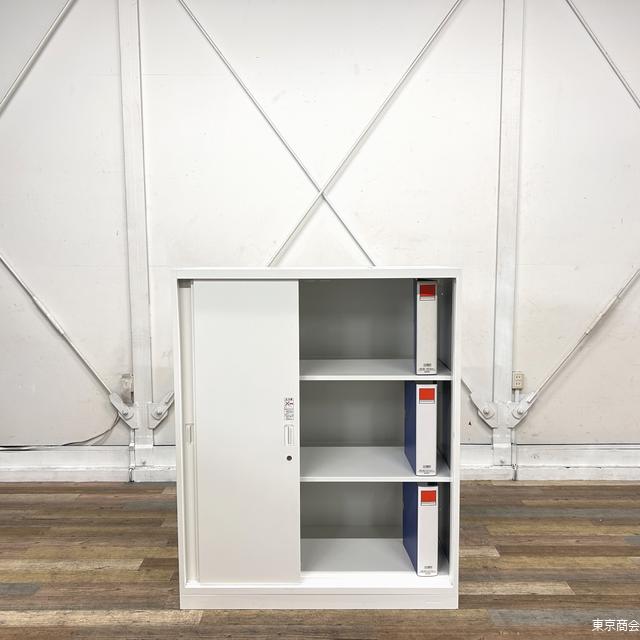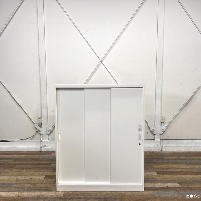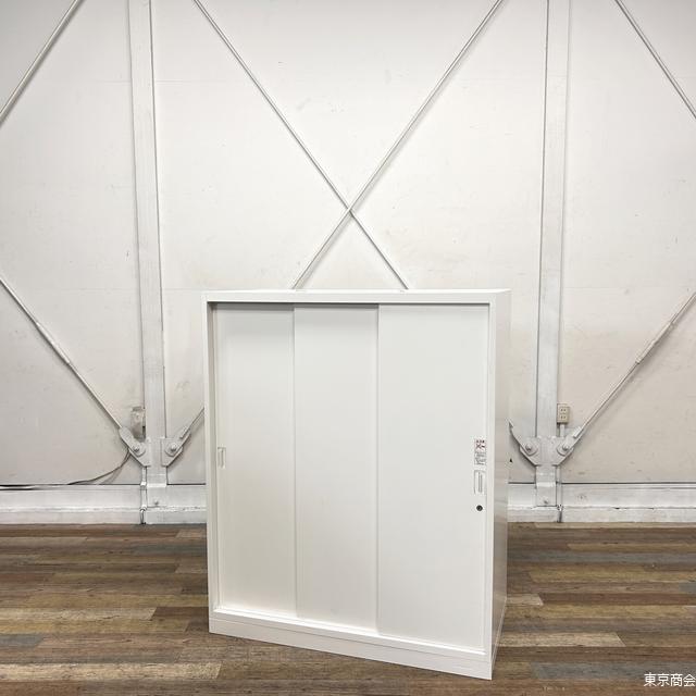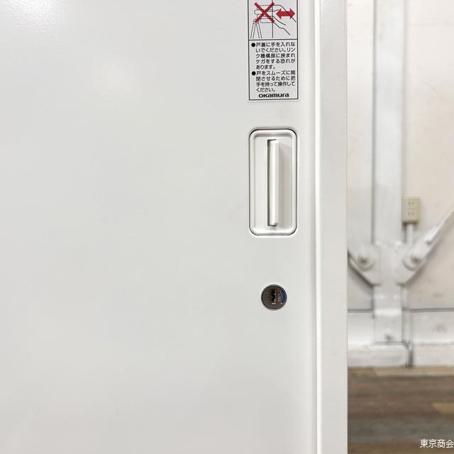 オカムラ製の3枚引き違い書庫。 引き違いタイプは開け閉めの際に周囲のスペースを気にする必要がないので、オフィス内の導線を邪魔することなく設置が可能です。 |